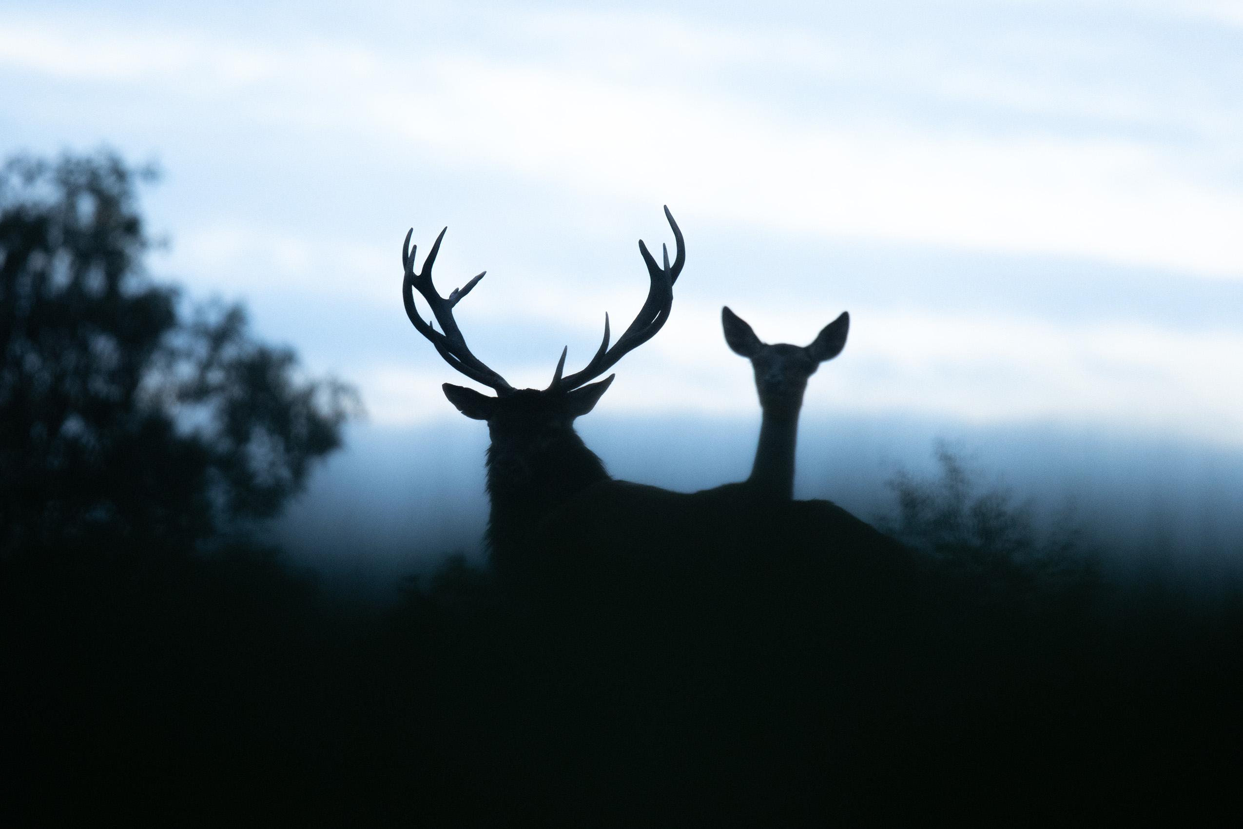 🪶 « Couché dans mon affût, j’entends les cerfs s’adonner à des vocalises puissantes. Je sais qu’à tout instant, la prairie devant laquelle je me suis installé peut devenir une autoroute. Le soleil se couche… Et ils sont là. Roi & reine m’offrent un spectacle de silhouettes incroyable qui me laissera un des plus beaux souvenirs du brame. »